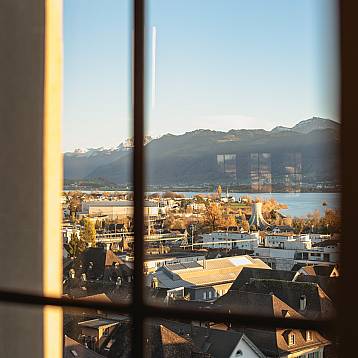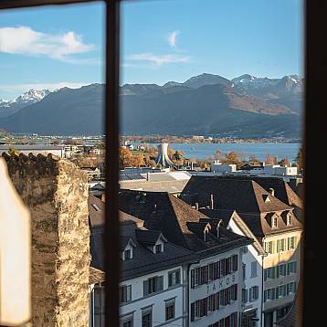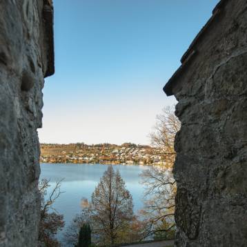 Vor dem Schlosstor, mit atemberaubender Aussicht auf den Zürichsee, lässt sich der Apéro vor dem Dinner perfekt geniessen.