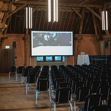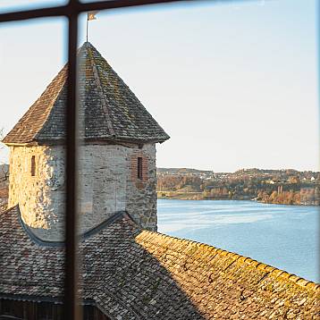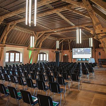 Mit historischem Charme befindet sich der Grosse Rittersaal im obersten Stock des Schlosses. Die Räumlichkeit verfügt über eine Bühne sowie moderne Lichttechnik. Durch die grossen Fenster auf beiden Seiten bietet sich eine einmalige Aussicht.