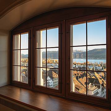 Die mit rustikalen Holzbalken und Blick auf die Altstadt ausgestattete Gaststube eignet sich ideal für kleinere Feste -  Dinners und Apéros aller Art.